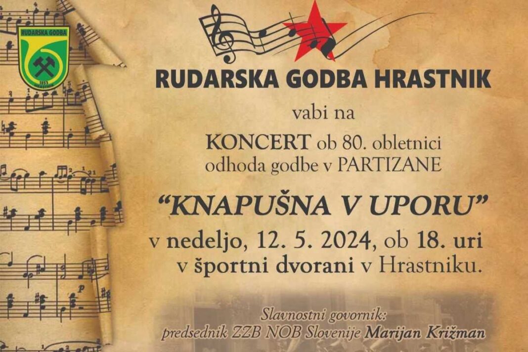 Rudarska godba Hrastnik pripravlja danes ob 18. uri v športni dvorani v Hrastniku koncert ob 80. obletnici odhoda godbe v partizane Knapušna v uporu. Godba bo igrala pod vodstvom dirigenta Uroša Razpotnika. Slavnostni govornik na koncertu bo predsednik Zveze združenj borcev za vrednote NOB Slovenije Marijan Križman. Gostje na koncertu bodo Partizanski pevski zbor in Mladinski in otroški pevski zbor ŠO narodnega heroja Rajka Hrastnik.