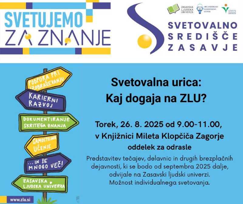 V Knjižnici Mileta Klopčiča v Zagorju ob Savi bodo danes od 9. do 11. ure pripravili svetovalno urico z naslovom Kaj dogaja na ZLU? »Vas zanima, kaj vse se bo dogajalo na Zasavski ljudski univerzi v jesenskih mesecih? Iščete priložnost za novo znanje, tečaj ali delavnico – pa ne veste, kje začeti? Na brezplačni svetovalni urici bomo predstavili pestro ponudbo tečajev, delavnic in drugih brezplačnih dejavnosti, ki jih od septembra dalje pripravljamo na ZLU, nudili osebno svetovanje in pomagali poiskati pravo izobraževanje, prilagojeno vašim ciljem in interesom.«