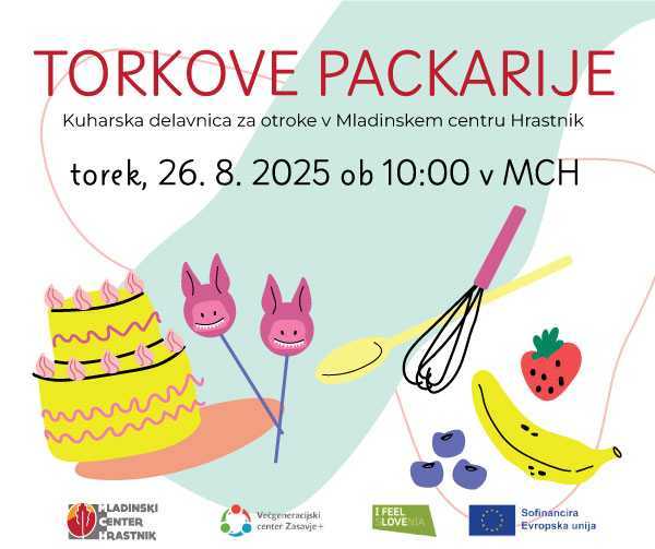 V Mladinskem centru Hrastnik bodo danes od 10. uri v okviru Poletnih počitnic v MCH pripravili ustvarjalno delavnico, ki so jo poimenovali Torkove packarije. Danes bodo pripravili slaščičarsko delavnico, kjer se bodo naučili ustvariti torto, jo skupaj okrasili in se potem z njo tudi posladkali. Vabljeni na kreativno ustvarjanje, packanje in sladkanje.