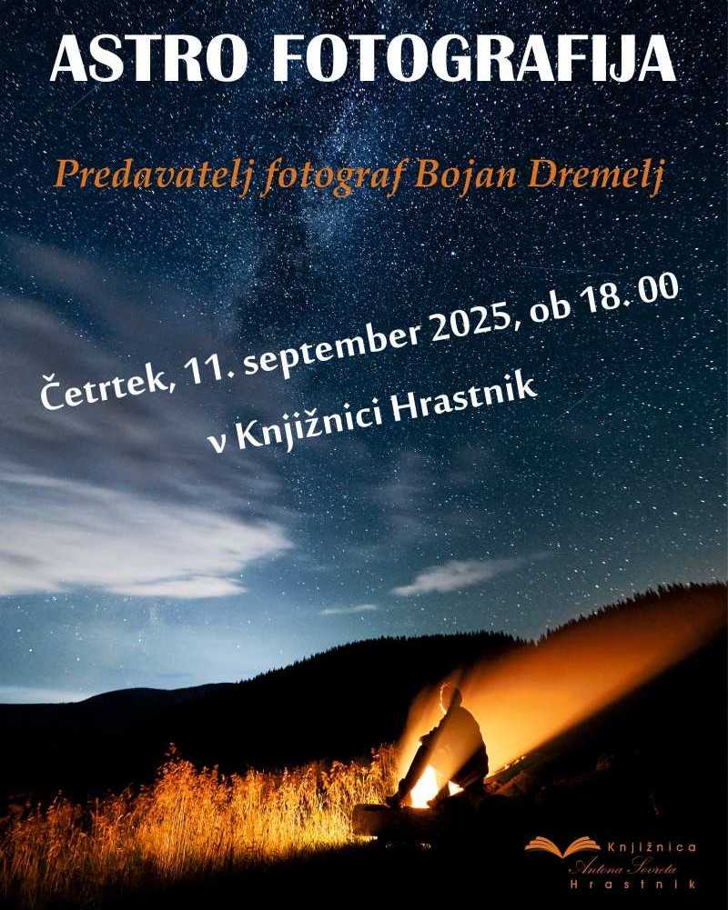 V Knjižnici Antona Sovreta v Hrastniku bodo danes ob 18. uri pripravili predavanje fotografa Bojana Dremlja Astro fotografija. Nočno nebo s svojimi zvezdami od nekdaj vznemirja človeka. S pozornim opazovanjem in beleženjem dogodkov je Dremelj odkrival čedalje več objektov in začel spoznavati zakone gibanja nebesnih teles. Daljnogledi in teleskopi so dodatno premaknili mejo pogleda, fotografija v kombinaciji s teleskopom pa je šele pokazala, kaj vse se skriva očem na nočnem nebu. Na predavanju boste spoznali, kako s pomočjo fotografije zajeti šibko svetlobo oddaljenih galaksij in meglic, katere pripomočke lahko uporabljajo tudi amaterji in različne tehnike astrofotografije. Predavanje poteka v sodelovanju s Foto klubom Dol pri Hrastniku.