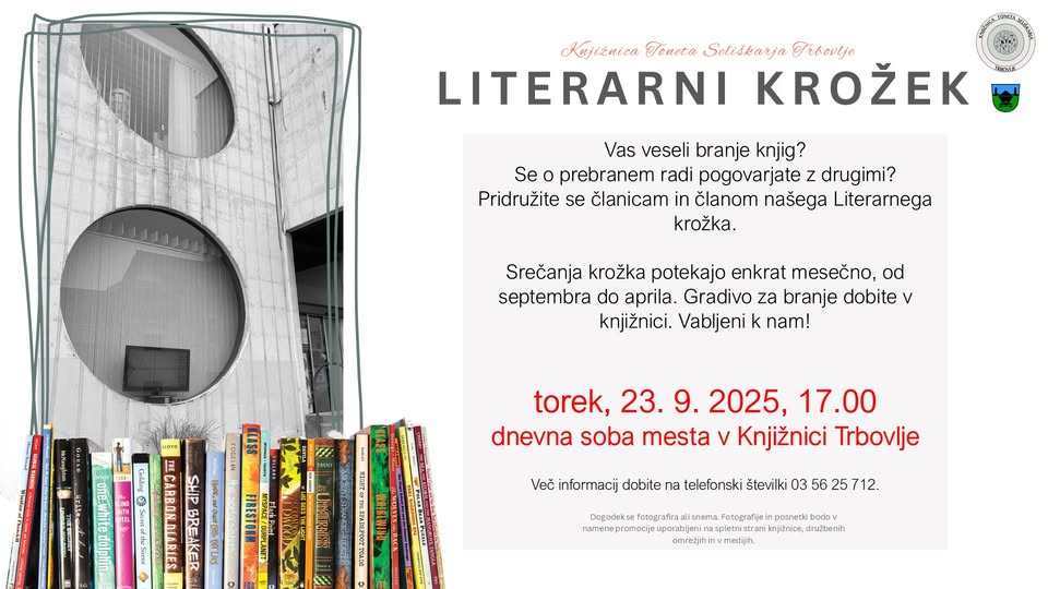 V dnevni sobi mesta v Knjižnici Toneta Seliškarja v Trbovljah bodo danes ob 17. uri pripravili literarni krožek. »Vas veseli branje knjig? Se o prebranem radi pogovarjate z drugimi? Pridružite se članicam in članom našega literarnega krožka. Srečanja potekajo enkrat mesečno od septembra do aprila. Gradivo za branje dobite v knjižnici,« so zapisali v vabilu.