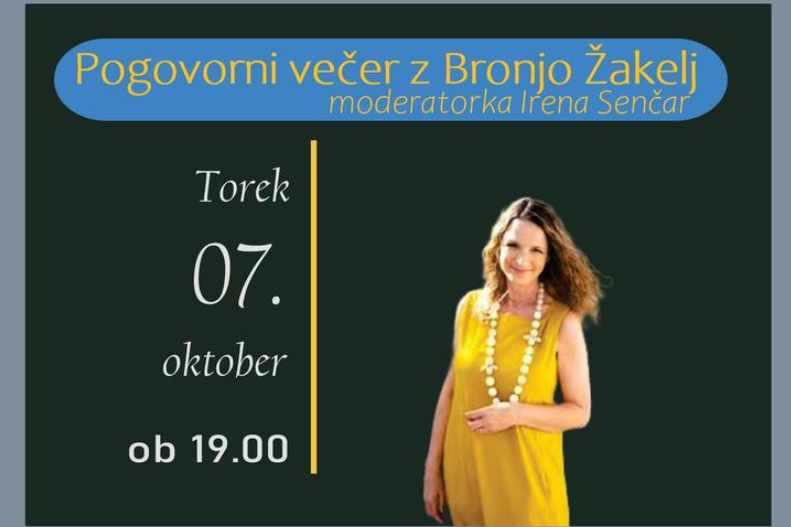 V torek, 7. oktobra ob 19. uri bodo v knjižnici gostili novinarko in pisateljico Bronjo Žakelj, ki je leta 2019 za svoj prvenec Belo se pere na devetdeset prejela Delovo književno nagrado kresnik. Avtobiografski roman, ki ga je pisala skoraj desetletje, se dotika njenega otroštva, izgube matere in brata ter lastne diagnoze raka. Roman je doživel 11 ponatisov, prodanih je bilo skoraj 21.000 izvodov, v letu 2025 pa je zgodba postala še osnova za celovečerni film pod taktirko režiserja Marka Naberšnika. Pogovor bo vodila Irena Senčar.