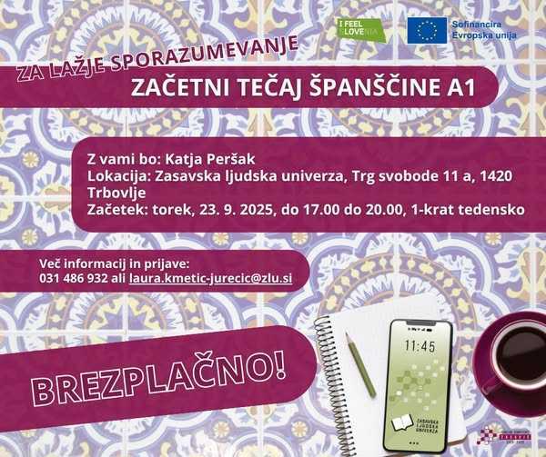 Zasavska ljudska univerza pripravlja danes v svojih prostorih v Zagorju ob 17. uri tečaj špančine, ki poteka vsak torek. »Vabljeni na začetni 40-urni tečaj španščine, kjer boste spoznali osnovne izraze in fraze, ki jih lahko takoj uporabite v vsakdanjih pogovorih. Tečaj poteka v sproščenem okolju, idealen za začetnike. Predavateljica je Katja Peršak.