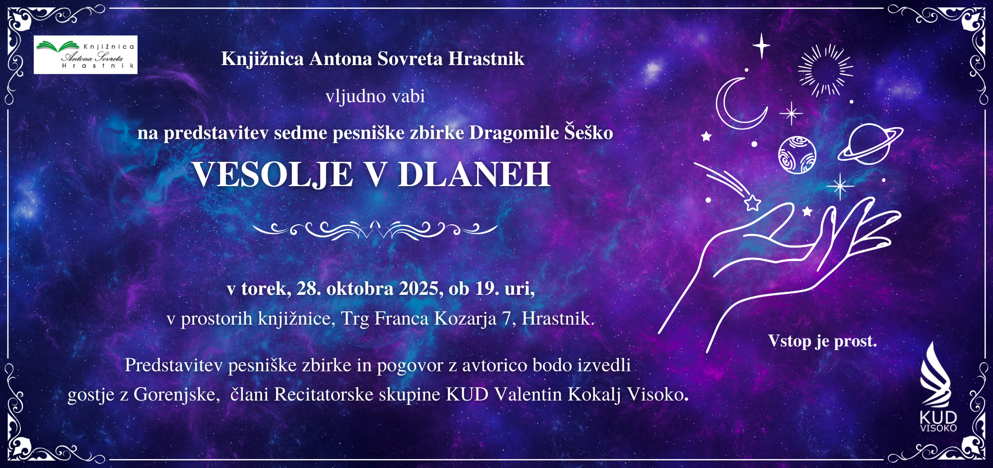 V Knjižnic Antona Sovreta v Hrastniku bodo danes ob 19. uri pripravili predstavitev pesniške zbirke Dragomile Šeško Veselje v dlaneh. Ustvarjanje pesnice (letnik 1961) seže globoko v ezoterične, filozofske in duhovne sfere. Njena poezija ni le izraz umetniškega čuta, temveč tudi iskanje resnice, notranjega miru in kozmične povezanosti. »Vabljeni na predstavitev zadnje pesniške zbirke in pogovor z avtorico. Na dogodku sodelujejo gostje z Gorenjske, člani Recitatorske skupine KUD Valentin Kokalj Visoko,« so zapisali v vabilu v knjižnici.