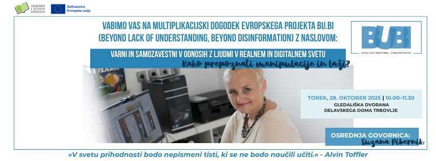 Danes ob 10. uri pripravlja Zasavska ljudska univerza v Delavskem domu Trbovlje (gledališka dvorana) multiplikacijski dogodek evropskega projekta BU.BI (Beyond lack of Understanding, Beyond disInformation) Varni in samozavestni v odnosih z ljudmi v realnem in digitalnem svetu (kako prepoznati manipulacije in laži). Projekt BU.BI krepi funkcionalno pismenost in digitalne veščine odraslih ter pomaga pri prepoznavanju dezinformacij in manipulacij v digitalnem okolju. Osrednja govornica bo Suzana Pibernik (univerzitetna diplomirana inženirka računalništva in informatike, NLP trenerka in coachinja z mednarodno licenco INLPTA). Spregovorila bo o tem, kako prepoznati manipulacije in laži, kako izbrati varne odnose v realnem svetu, kako varno uporabljati digitalne aplikacije, zakaj so starejši in ranljivejši posamezniki še posebej izpostavljeni pastem spleta. »Dogodek je srečanje skupnosti učečih se – priložnost za izobraževanje, druženje, sprostitev in pogostitev,« so zapisali v vabilu.