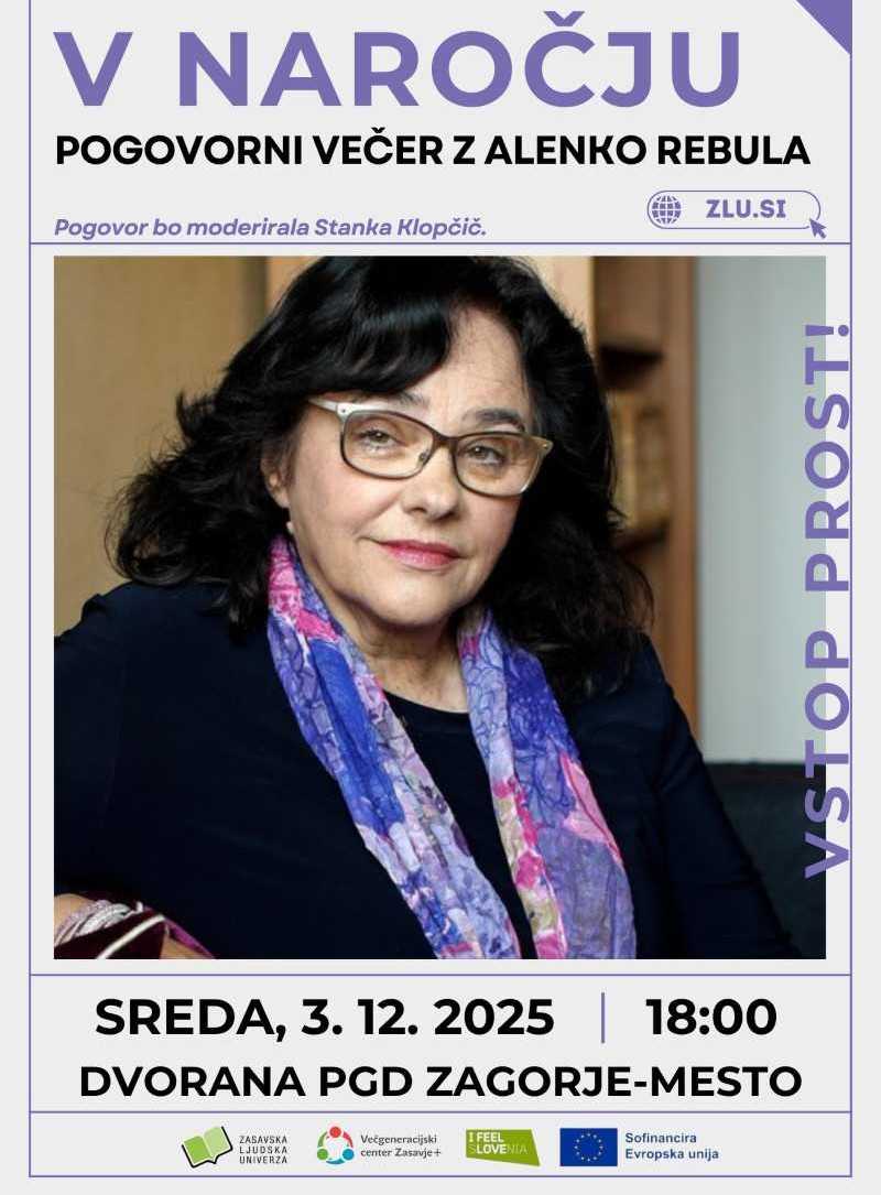 Zasavska ljudska univerza prireja v sredo, 3. decembra 2025 v dvorani PGD Zagorje-mesto pogovorni večer z Alenko Rebula z naslovom V naročju. Pogovor bo moderirala Stanka Klopčič. Alenka Rebula že vse življenje živi in dela v Trstu, rojena pa je v Loki pri Zidanem Mostu. Je diplomirana filozofinja, več let je delala kot psihologinja in profesorica humanističnih ved na višjih šolah v Italiji. Svoje bogato znanje in življenjske izkušnje prepleta z razumevanjem notranjega sveta človeka – njegove rasti, čustev in odnosov. Širša javnost jo pozna po knjigah Globine, ki so nas rodile, Blagor ženskam in Sto obrazov notranje moči. Zadnja leta jo lahko spremljamo tudi na njeni spletni strani Dežela vere vase, kjer redno objavlja svoja razmišljanja o življenju, nežnosti in moči srca.