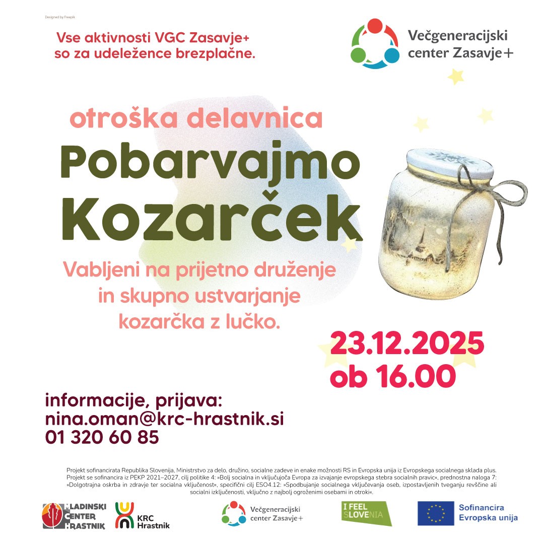 Večgeneracijski center Zasavje pripravlja danes ob 16. uri v Mladinskem centru v Hrastniku otroško delavnico Pobarvajmo kozarček. »Vabljeni na prijetno druženje in skupno ustvarjanje kozarčka z lučko,« so zapisali v vabilu.