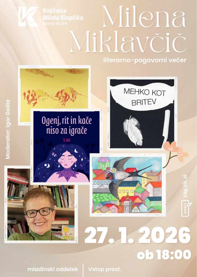 Danes ob 18. uri bodo v Knjižnici Mileta Klopčiča v Zagorju pripravili literarno pogovorni večer z Mileno Miklavčič, priznano pisateljico in pripovedovalko zgodb iz resničnega življenja, avtorico številnih knjig. »V pogovoru se bomo dotaknili avtoričinega ustvarjanja, življenjskih zgodb ter knjig Ogenj, rit in kače niso za igrače in Mehko kot britev, ki sta med bralci sprožili veliko zanimanja in razmisleka. Večer bo priložnost za poglobljen pogovor, izmenjavo mnenj ter srečanje z avtorico, ki s svojim delom odpira pomembna vprašanja o življenju, odnosih in družbi,« so zapisali v vabilu. Pogovor bo moderiral Igor Gošte.