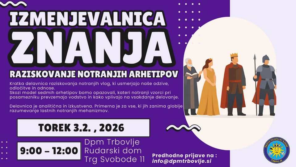 Vabljeni na kratko, a poglobljeno delavnico raziskovanja notranjih vlog, ki usmerjajo naše odzive, odločitve in odnose. S pomočjo modela sedmih arhetipov bomo opazovali, kateri notranji vzorci pri posamezniku prevzemajo vodstvo in kako vplivajo na naše vsakdanje delovanje. Delavnica je analitična in izkustvena ter primerna za vse, ki jih zanima globlje razumevanje lastnih notranjih mehanizmov in osebne rasti (od 9. do 12. ure v DPM Trbovlje).