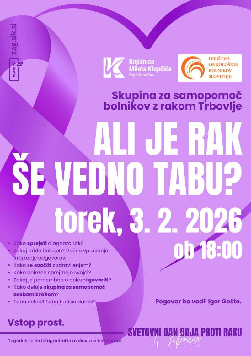 V Knjižnici Mileta Klopčiča bo Skupina za samopomoč bolnikov z rakom Trbovlje pripravila ob svetovnem dnevu boja proti raku danes ob 18. uri pogovor Ali je rak še vedno tabu. Pogovor bo vodil Igor Gošte. Med drugim bodo spregovorili o tem, kako sprejeti diagnozo, zakaj pride do bolezni, kako se soočiti z zdravljenje, kako sprejmejo bolezen svojci, zakaj je pomembno govoriti o njej, kako deluje skupina za samopomoč osebam z rakom.