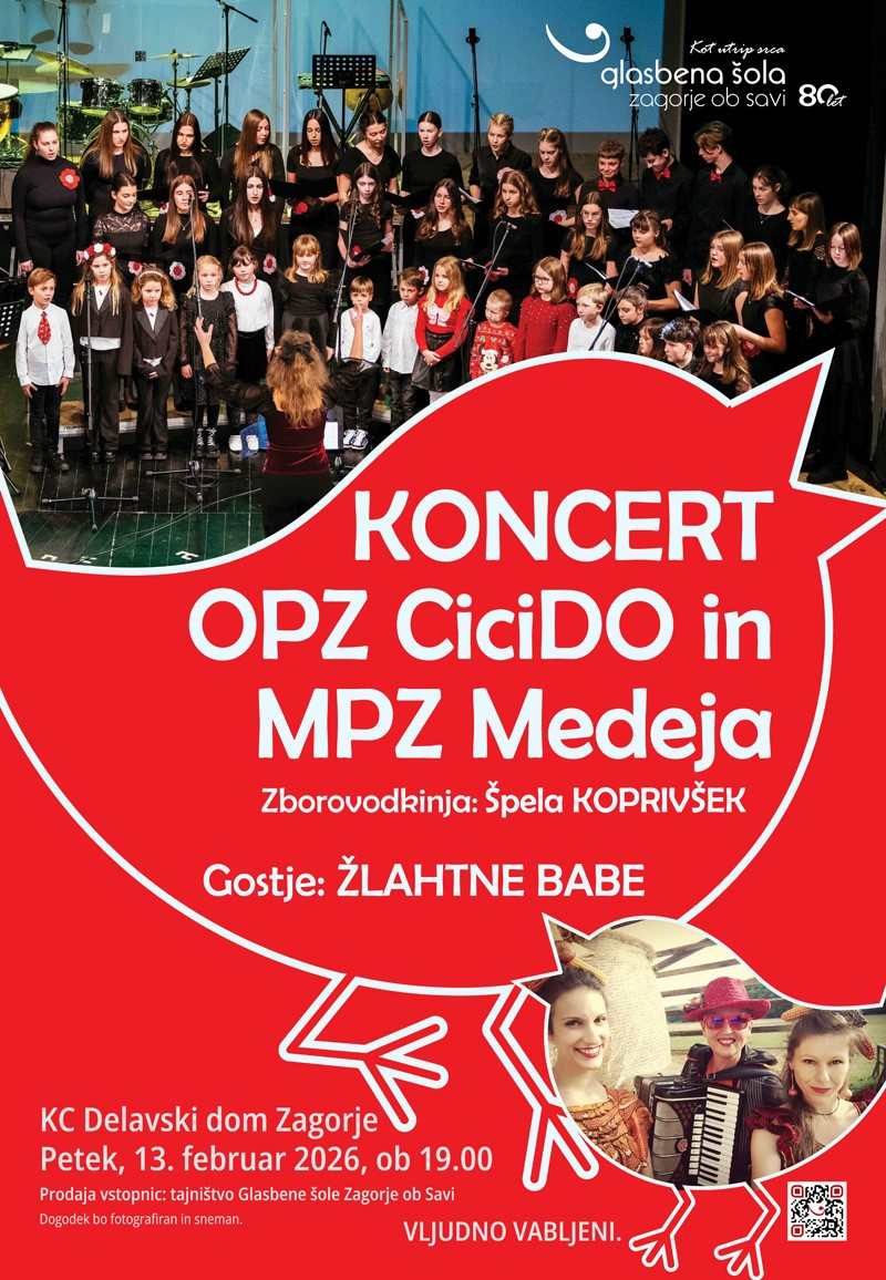 Jubilejni cikel, ki ga pripravlja Glasbena šola Zagorje v letu, ko praznuje 80 let delovanja, se nadaljuje z večerom, posvečenim zborovski glasbi. V petek, 13. februarja 2026, ob 19. uri bo KC Delavski dom Zagorje gostil Otroški pevski zbor CiciDO in Mladinski pevski zbor Medeja. Pod vodstvom zborovodkinje Špele Koprivšek bodo mladi pevci predstavili raznolik in barvit program. Koncertni večer bodo s svojo prepoznavno energijo in hudomušnostjo obogatile posebne gostje Žlahtne babe.