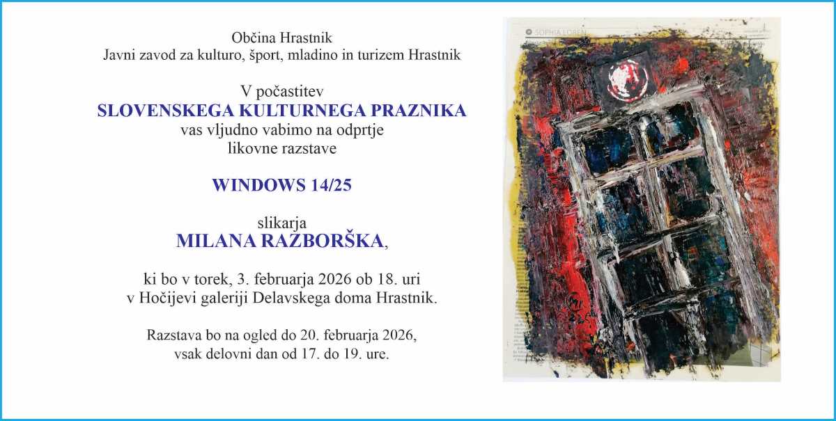 V Hočijevi galeriji Delavskega doma Hrastnik je v počastitev slovenskega kulturnega praznika na ogled likovna razstava Windows 14/25 slikarja Milana Razborška. Milan Razboršek je diplomant Visoke šole za risanje in slikanje v Ljubljani. Je vodja Galerije Medija v Zagorju ter umetniški vodja slikarske kolonije Izlake – Zagorje ob Savi. Razstava bo na ogled do 20. februarja vsak delovni dan od 17. do 19. ure.