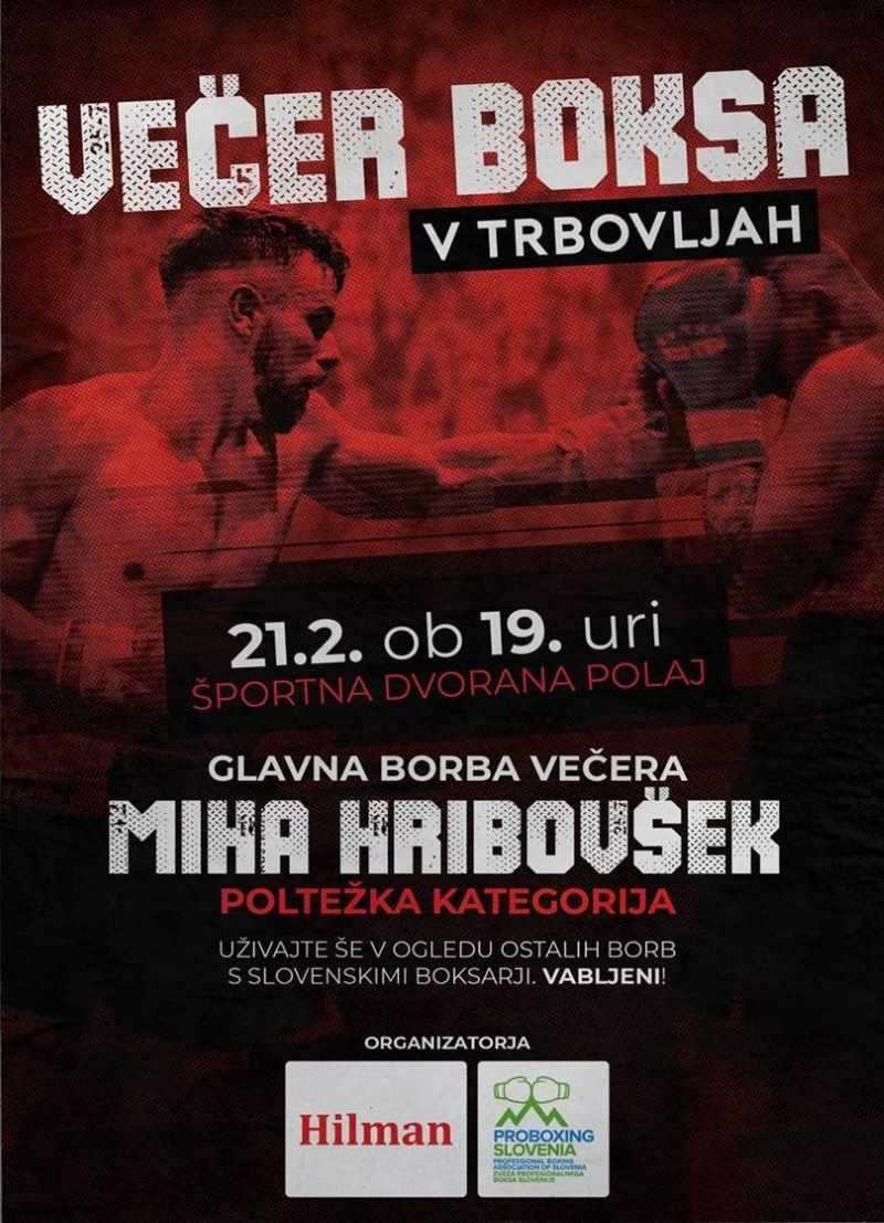 Danes ob 19. uri v dvorani Polaj pripravljajo Večer boksa. Organizatorja boksarske revije sta podjetje Hilman in Proboxing Slovenia, ki ga vodi nekdanji odlični slovenski boksar Dejan Zavec. Na ringu bo na sporedu šest amaterskih borb slovenskih boksarjev in ena profesionalna, ki bo spektakel večera. V glavni vlogi bo Trboveljčan Miha Hribovšek, ki se bo v borbi večera v poltežki kategoriji pomeril s češkim tekmecem Milanom Grundzo.