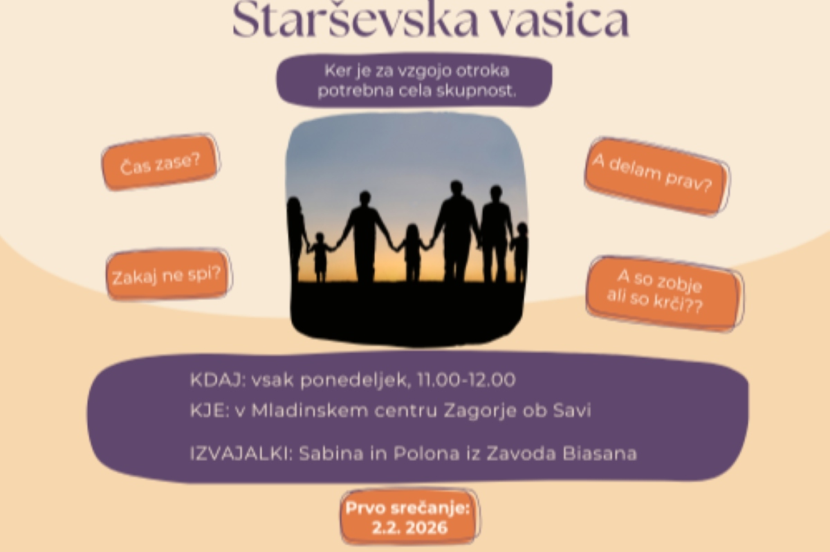 Večgeneracijski center Zasavja pripravlja vsak ponedeljek od 11. do 12. ure v prostorih Mladinskega centra v Zagorju delavnico, ki so jo poimenovali Starševska vasica. Zakaj? Ker je za vzgojo otroka potrebna cela skupnost. Izvajalki bosta Sabina in Polona iz Zavoda Biasana. Skušali bosta odgovoriti tudi na vprašanja: Čas zase?. A delam prav?, Zakaj ne spi? A so zobje ali krči?