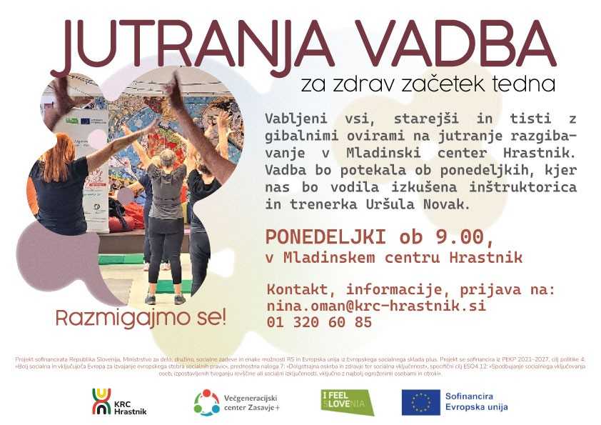 Večgeneracijski center Zasavja pripravlja vsak ponedeljek ob 9. uri jutranjo vadbo za zdrav začetek tedna. »Vabljeni vsi, starejši in tisti z gibalnimi ovirami na jutranjo razgibavanje v Mladinski center Hrastnik. Vadba bo potekala ob ponedeljkih, vodila jo bo izkušena inštruktorica in trenerka Uršula Novak.