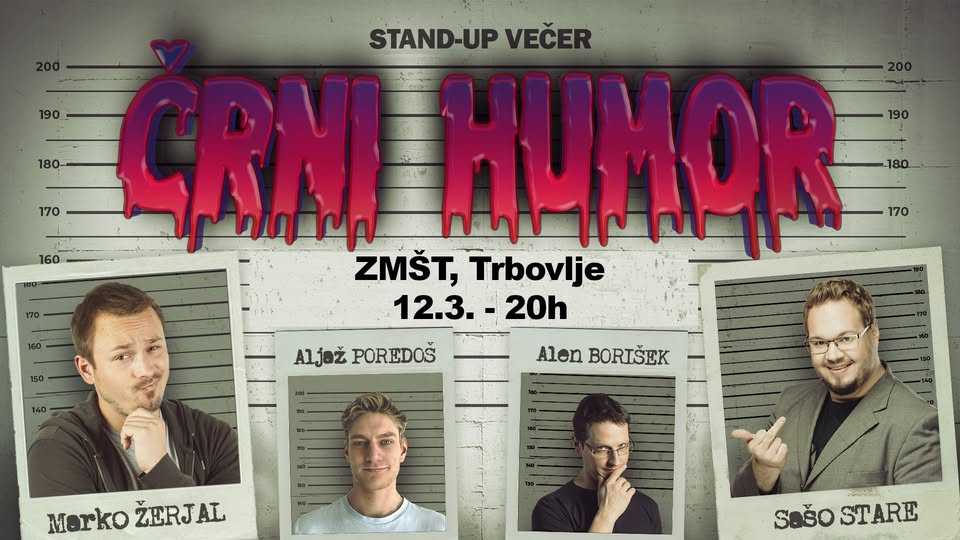 Danes ob 20. uri bodo v kavarni ZMŠT v Trbovljah pripravili večer črnega humorja. »Ste za črno? V Trbovlje namreč prihajajo štirje specialisti za norčevanje iz najbolj neprimernih tematik sploh, Sašo Stare, Marko Žerjal, Alen Borišek in Aljaž Poredoš. Če ste tip človeka, ki ga politično nekorektne šale brez filtra nasmejejo, potem bo to definitivno večer za vas! Pravijo, da je smeh pol zdravja, razen če se smeješ našim foram – pol si že na pol bolan. 16+!« so zapisali v vabilu organizatorji.