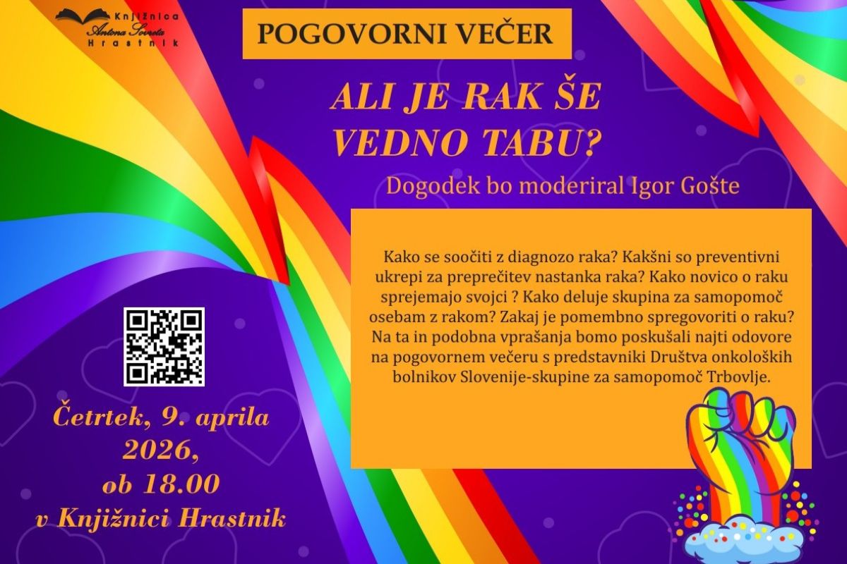 Danes bo ob 18. uri v Knjižnici Antona Sovreta Hrastnik potekal pogovorni večer Ali je rak še vedno tabu?, na katerem boste skupaj s predstavniki Društva onkoloških bolnikov Slovenije – skupine za samopomoč Trbovlje spregovorili o soočanju z diagnozo raka, preventivi, podpori svojcem in pomenu odprtega pogovora. Pogovor bo moderiral Igor Gošte.