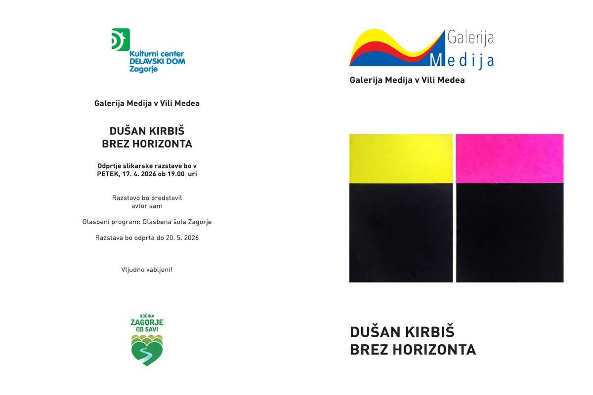 Vabljeni danes v Galerijo Medija kjer bo potekalo odprtje razstave abstraktnih slik z naslovom Brez horizonta, avtor del je Dušan Kirbiš. Odprtje razstave bo ob 17. uri, popestrili ga bodo učenci Glasbene šole Zagorje. Dušan Kirbiš je umetnik, ki je študiral umetnost po vsem svetu, od leta 2000 do 2017 je bil redni profesor na ljubljanski NTF, med letoma 2017 in 2025 pa je opravljal funkcijo prodekana za umetnost. V svojem zadnjem sklopu abstraktnih slik nadaljuje premišljen dialog med vizualnim medijem in njegovo pojavnostjo. Na razstavi predstavljene slike so intimen izraz avtentičnih vsebin, ki se povezujejo z občimi in stalno prisotnimi vprašanji bivanjske usodnosti slikarskega medija. Razstava bo na ogled do 20. maja 2026. Galerija je odprta ob ponedeljkih in četrtkih od 15. do 19. ure, ob torkih, sredah in petkih pa od 10. do 14. ure.