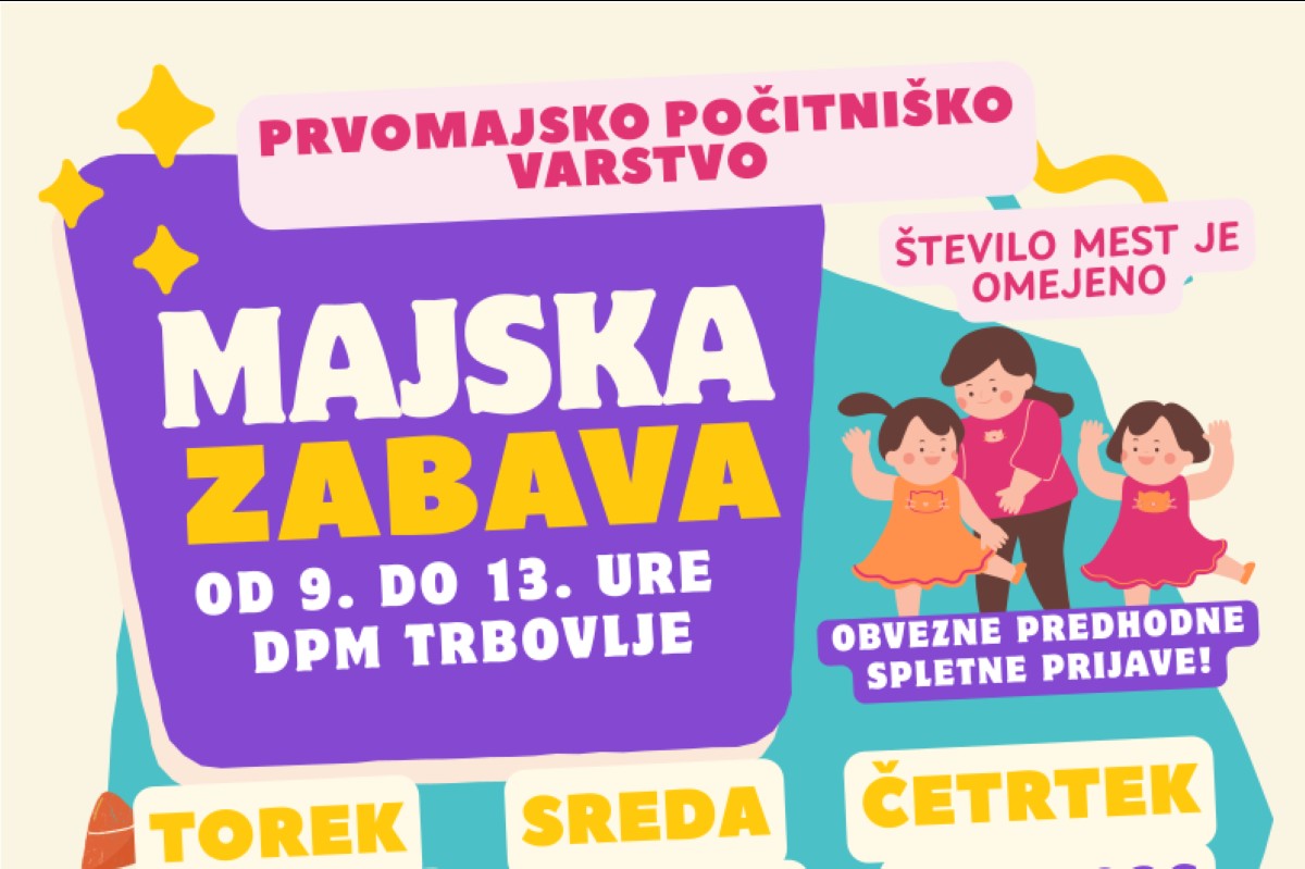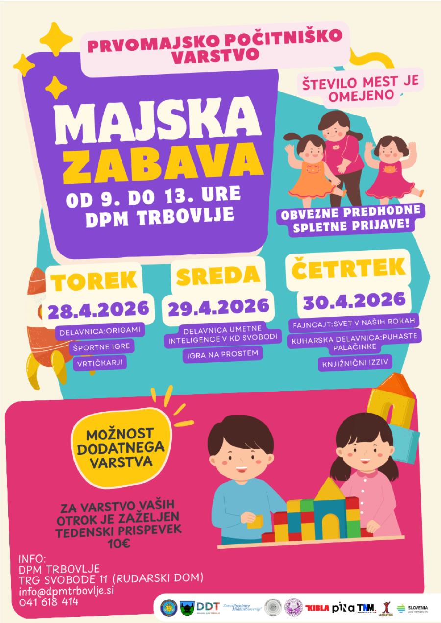 Društvo prijateljev mladine Trbovlje bo med prvomajskimi počitnicami za otroke pripravilo pester program počitniškega varstva z naslovom Majska zabava. Aktivnosti bodo potekale od 28. do 30. aprila 2026, vsak dan med 9. in 13. uro, v prostorih DPM Trbovlje.