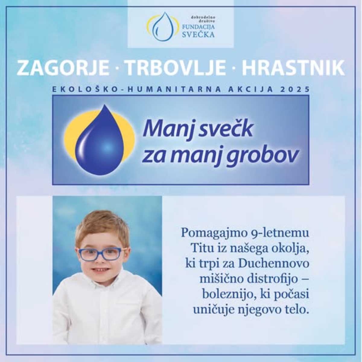 Zbrana sredstva vseh zasavskih občin bodo namenili 9-letnemu Titu, ki se pogumno spopada z redko in žal smrtonosno boleznijo Duchennovo mišično distrofijo. Njegove mišice vse bolj slabijo, vsak dan je gibanje težje, bolezen, ki mu je že vzela velik del mobilnosti, pa ga bo kmalu prikovala na invalidski voziček. Sredstva akcije bodo namenjena nakupu hišnega dvigala in prilagoditvi doma.