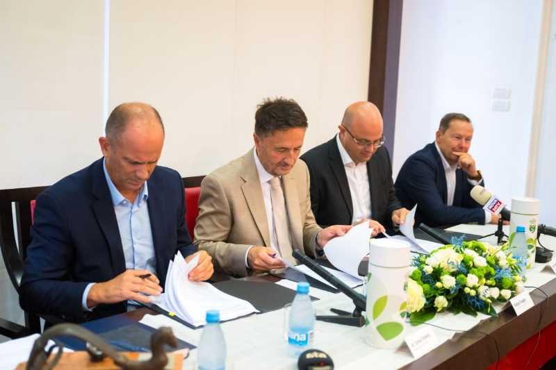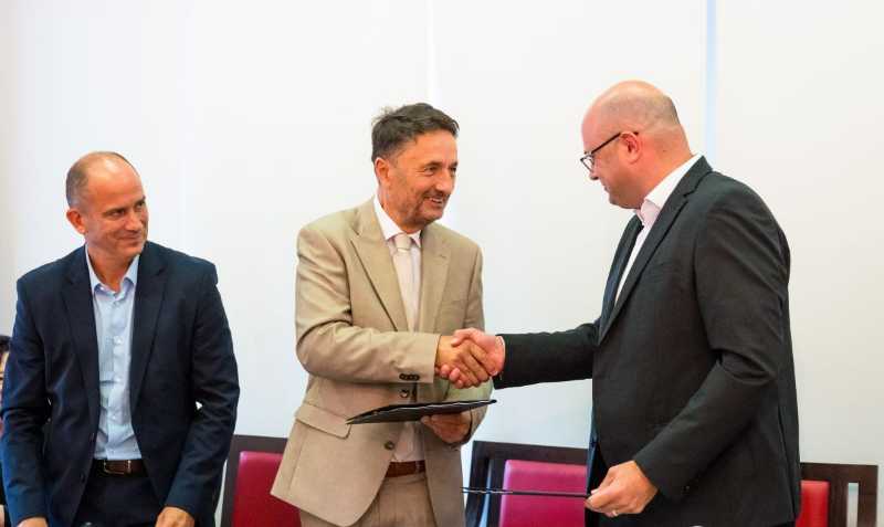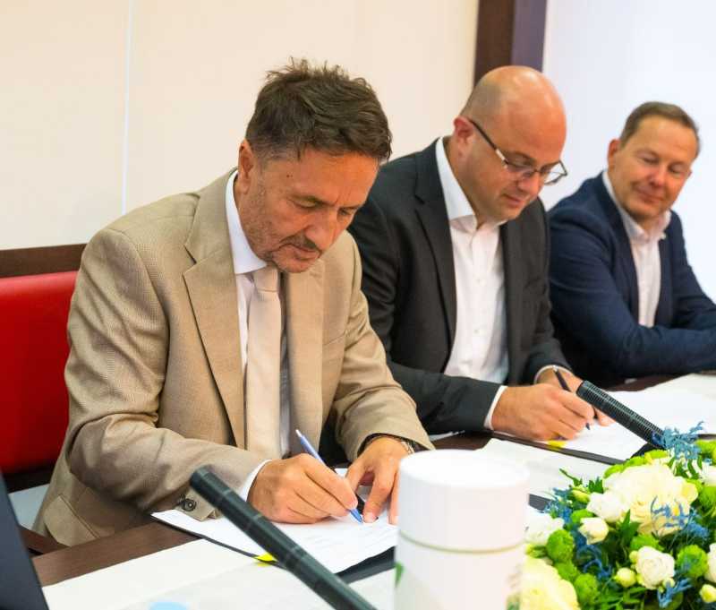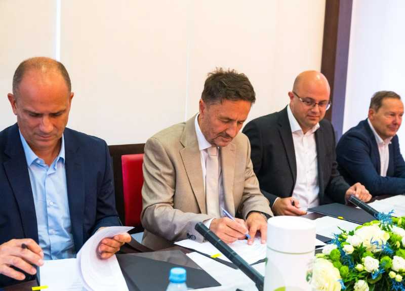 Župan Občine Zagorje ob Savi Matjaž Švagan, direktor Holdinga Slovenske elektrarne (HSE) dr. Tomaž Štokelj in poslovni direktor HSE Uroš Podobnik so danes, v sredo, 6. avgusta, podpisali pogodbo o ustanovitvi stavbne in služnostne pravice za postavitev sončne elektrarne na območju zaprtega odlagališča nenevarnih odpadkov Kamnolom Zagorje.