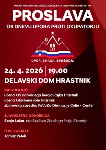 Občina Hrastnik in Zveza borcev za vrednote NOB Hrastnik bosta proslavo ob dnevu upora proti okupatorju pripravili v petek, 24. aprila, ob 19. uri v Delavskem domu Hrastnik. Osrednja govorka bo predsednica Ženskega lobija Slovenije Sonja Lokar, nastopili bodo učenci Osnovne šole narodnega heroja Rajka Hrastnik in Glasbene šole Hrastnik ter zborovska zasedba FaVoZa iz Gimnazije Celje Center. Po uradnem delu vabljeni tudi na pogostitev v Hočijevo galerijo Delavskega doma Hrastnik.