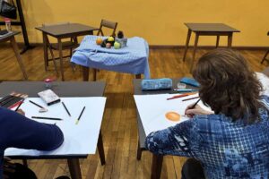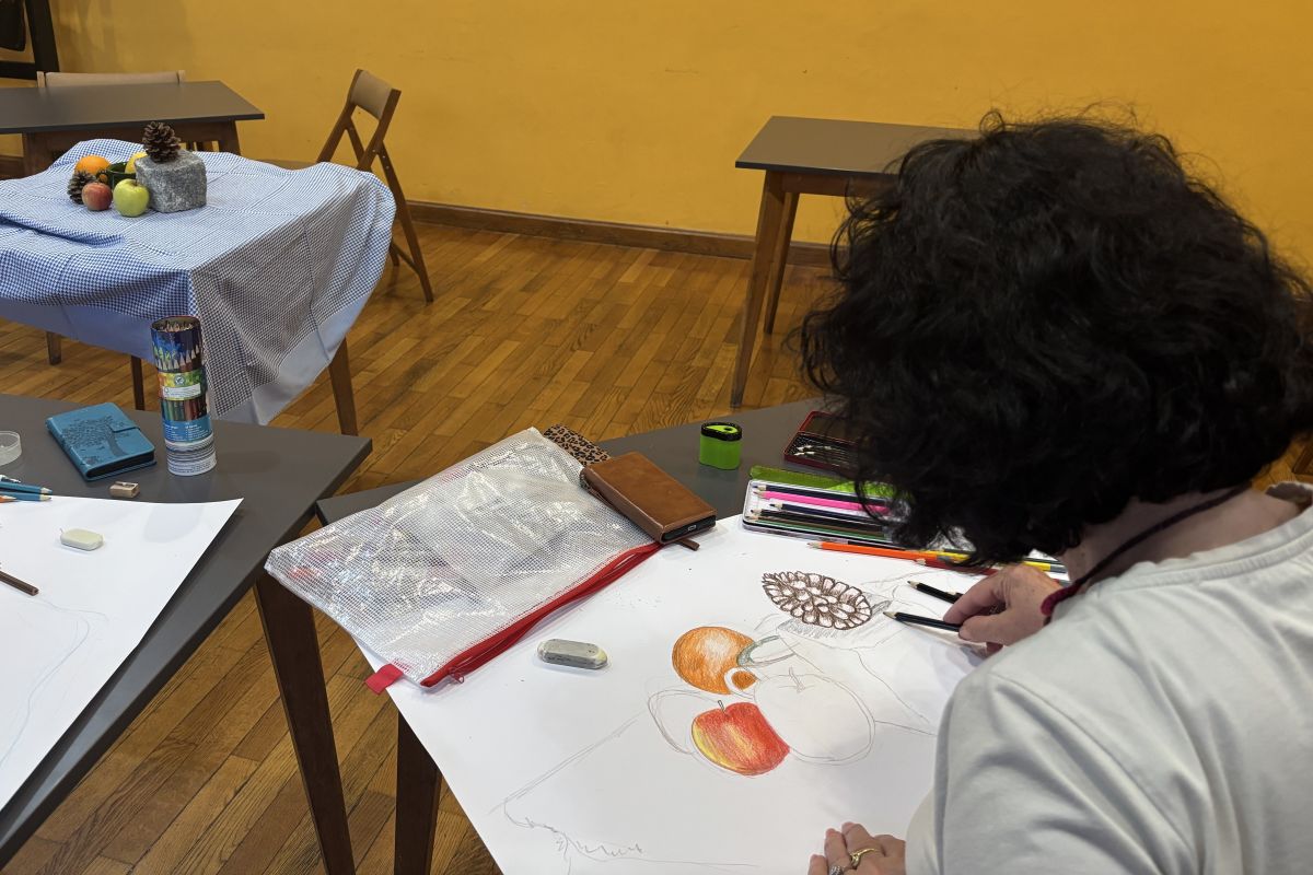 Pod okriljem študijskega krožka Ustvarjam, torej sem pa se je odvijala edinstvena zgodba ustvarjalnosti, trajnosti in povezanosti z naravo. Pod mentorstvom umetnika Matica Kosa so udeleženke krožka raziskovale preplet umetnosti in odgovornega ravnanja z okoljem. Ustvarjanje je potekalo z naravnimi in recikliranimi materiali – med drugim so slikale s temperami na kose lesa, lubje in druge že uporabljene materiale, ki so tako dobili novo življenje. S tem so udeleženke ne le ustvarjale umetniška dela, temveč hkrati razvijale zavest o pomenu trajnosti in spoštljivega odnosa do narave. Poleg praktičnega dela, kjer so se spoznavale z različnimi likovnimi tehnikami, načini risanja in izražanja, so pridobile tudi trdno teoretično osnovo.