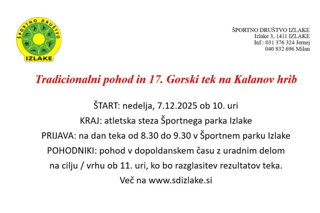 Športno društvo Izlake, Krajevna skupnost Izlake in Turistično društvo Izlake tudi letos vabijo vse ljubitelje narave, gibanja in dobre družbe na tradicionalni pohod ter 17. gorski tek na Kalanov hrib – Kal’nč’k 2025. Dogodek poteka v okviru projekta Slovenija v gibanju pri Športni uniji Slovenije in že vrsto let privablja številne tekače in pohodnike iz širše Zasavske regije.
